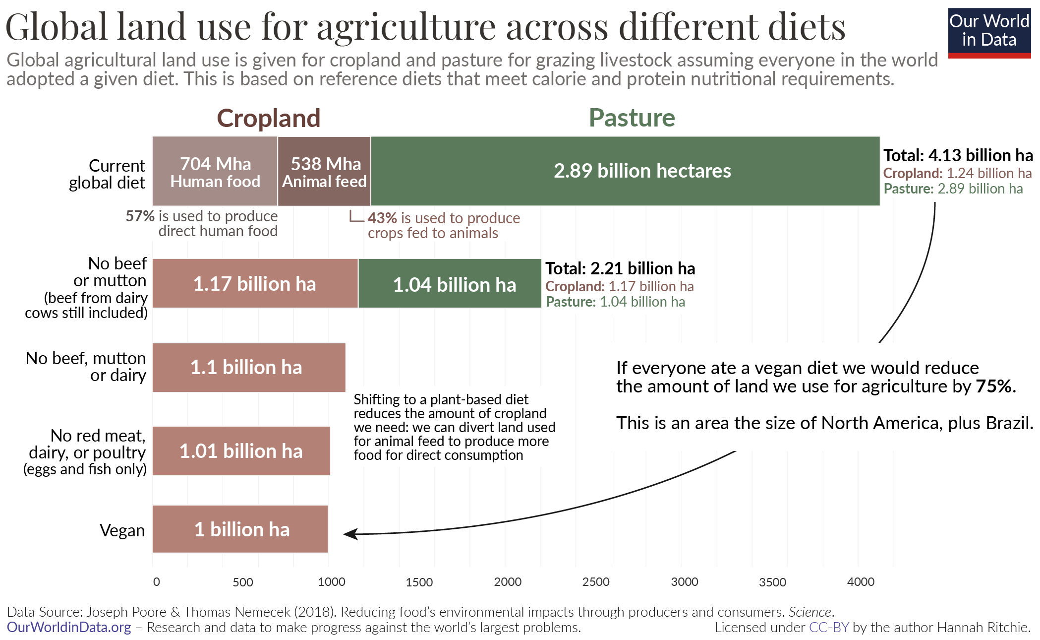 Research suggests that if everyone shifted to a plant-based diet, we would reduce global land use for agriculture by 75%. This large reduction of agricultural land use would be possible thanks to a reduction in land used for grazing and a smaller need for land to grow crops.